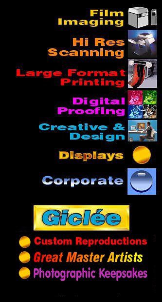 Film Imaging Hi Res Scanning Large Format Printing Digital Proofing Creative & Design   Displays     Corporate     Giclee Reproductions